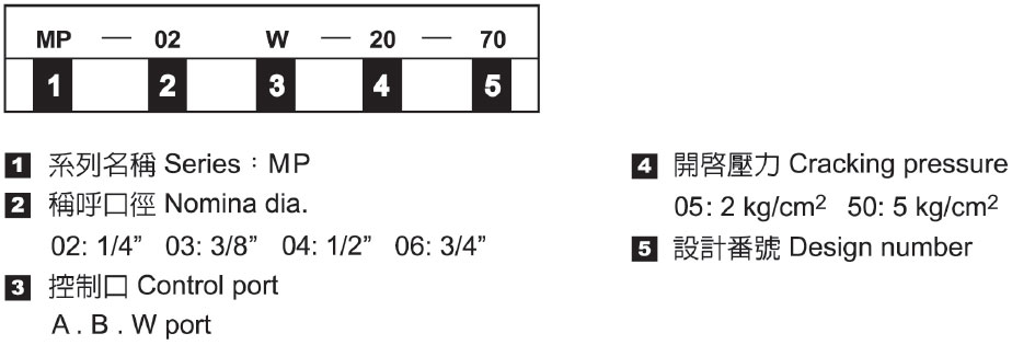 TAICIN積層型引導(dǎo)止回閥常規(guī)型號(hào)參考:MP-02A , MP-02B , MP-02W , MP-03A , MP-03B , MP-03W , MP-04A , MP-04B , MP-04W , MP-06A , MP-06B , MP-06W