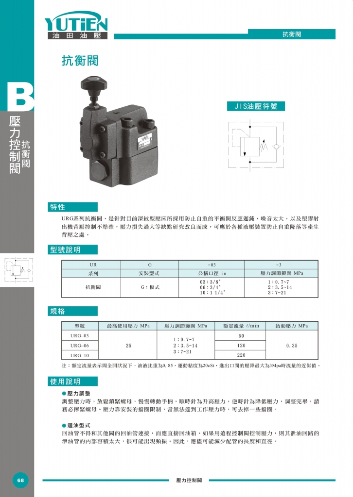 YUTIEN抗衡閥常規(guī)型號參考:URG-03-1 , URG-03-2 , URG-03-3 , URG-06-1 , URG-06-2 , URG-06-3 , URG-10-1 , URG-10-2 , URG-10-3