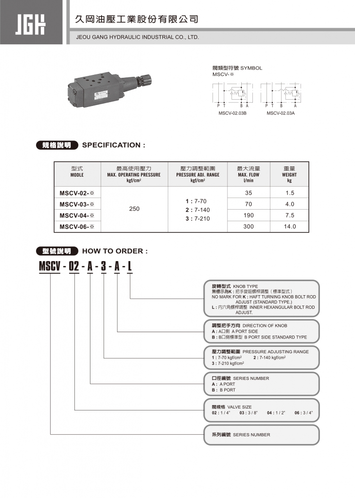 JGH久岡疊加式控制閥部分常規(guī)型號(hào)參考:MSCV-02-A-1-A , MSCV-02-A-1-B , MSCV-02-A-2-A , MSCV-02-A-2-B , MSCV-02-A-3-A , MSCV-02-A-3-B , MSCV-02-B-1-A , MSCV-02-B-1-B , MSCV-02-B-2-A , MSCV-02-B-2-B , MSCV-02-B-3-A , MSCV-02-B-3-B , MSCV-03-A-1-A , MSCV-03-A-1-B , MSCV-03-A-2-A , MSCV-03-A-2-B , MSCV-03-A-3-A , MSCV-03-A-3-B , MSCV-03-B-1-A , MSCV-03-B-1-B , MSCV-03-B-2-A , MSCV-03-B-2-B , MSCV-03-B-3-A , MSCV-03-B-3-B , MSCV-04-A-1-A , MSCV-04-A-1-B , MSCV-04-A-2-A , MSCV-04-A-2-B , MSCV-04-A-3-A , MSCV-04-A-3-B , MSCV-04-B-1-A , MSCV-04-B-1-B , MSCV-04-B-2-A , MSCV-04-B-2-B , MSCV-04-B-3-A , MSCV-04-B-3-B , MSCV-06-A-1-A , MSCV-06-A-1-B , MSCV-06-A-2-A , MSCV-06-A-2-B , MSCV-06-A-3-A , MSCV-06-A-3-B , MSCV-06-B-1-A , MSCV-06-B-1-B , MSCV-06-B-2-A , MSCV-06-B-2-B , MSCV-06-B-3-A , MSCV-06-B-3-B