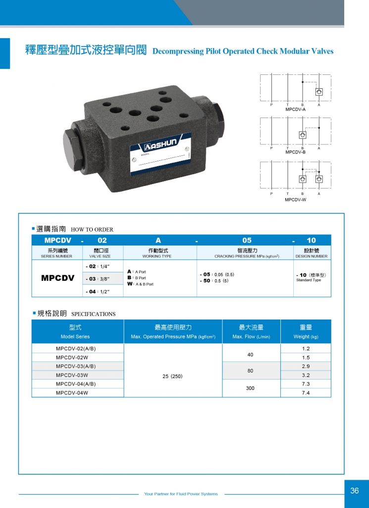 ASHUN釋壓型疊加式液控單向閥常規(guī)型號(hào)參考:MPCDV-02A-05-10 , MPCDV-02A-50-10 , MPCDV-02B-05-10 , MPCDV-02B-50-10 , MPCDV-02W-05-10 , MPCDV-02W-50-10 , MPCDV-03A-05-10 , MPCDV-03A-50-10 , MPCDV-03B-05-10 , MPCDV-03B-50-10 , MPCDV-03W-05-10 , MPCDV-03W-50-10 , MPCDV-04A-05-10 , MPCDV-04A-50-10 , MPCDV-04B-05-10 , MPCDV-04B-50-10 , MPCDV-04W-05-10 , MPCDV-04W-50-10
