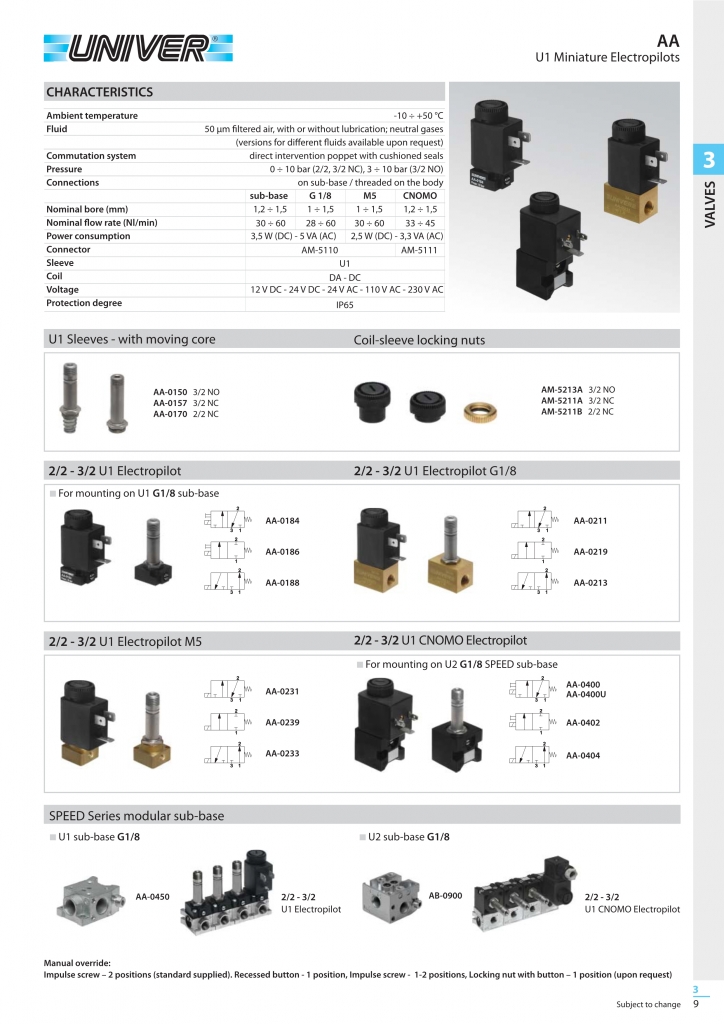 UNIVER微型電磁閥部分常規(guī)型號參考:AA-0150 , AA-0157 , AA-0170 , AA-0184 , AA-0186 , AA-0188 , AA-0211 , AA-0219 , AA-0213 , AA-0231 , AA-0239 , AA-0233 , AA-0400 , AA-0400U , AA-0402 , AA-0404 , AA-0450 , AB-0900 , AM-5213A , AM-5211A , AM-5211B