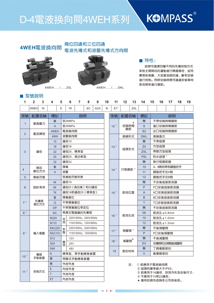 KOMPASS電液換向閥部分常規(guī)型號(hào)參考:4WEH-10 , 4WEH-10-H , 4WEH-16 , 4WEH-16-H , 4WEH-22 , 4WEH-22-H , 4WEH-25 , 4WEH-25-H , 4WEH-32 , 4WEH-32-H , 4WH-10 , 4WH-10-H , 4WH-16 , 4WH-16-H , 4WH-22 , 4WH-22-H , 4WH-25 ,