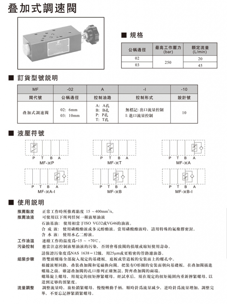 NORTHMAN疊加式調(diào)速閥部分常規(guī)型號(hào)參考:MF-02A-10 , MF-02A-I-10 , MF-02B-10 , MF-02B-I-10 , MF-02P-10 , MF-02P-I-10 , MF-02T-10 , MF-02T-I-10 , MF-03A-10 , MF-03A-I-10 , MF-03B-10 , MF-03B-I-10 , MF-03P-10 , MF-03P-I-