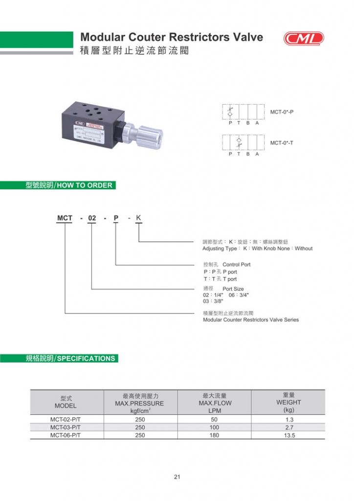 CML積層型附止逆流節(jié)流閥部分常規(guī)型號參考:MCT-02-P、MCT-02-T、MCT-03-P、MCT-03-T、MCT-06-P、MCT-06-T