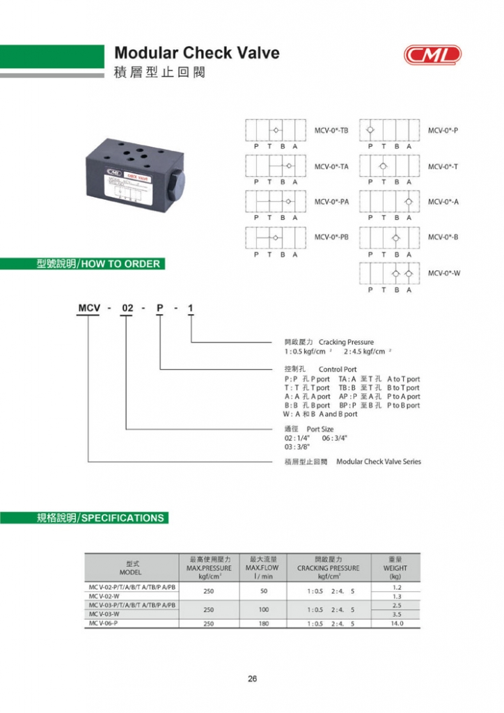 CML積層閥,積層止回閥MCV-02,MCV-03系列型號(hào)參考