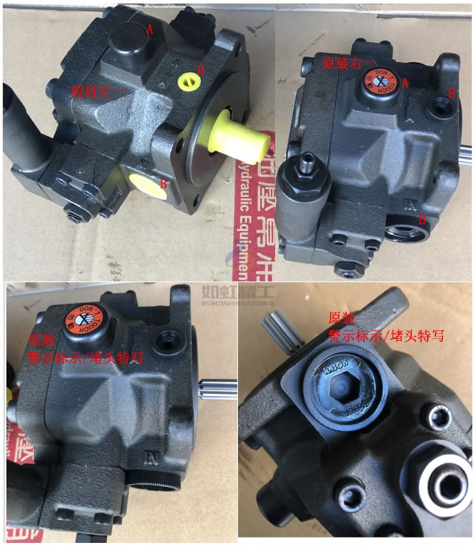 a∶假冒VP5F系列(左),警示勿動(dòng)標(biāo)示大多數(shù)沒有或標(biāo)示粗糙隨意,如圖左A。油口堵頭為劣質(zhì)黃色/紅色塑料堵頭,靠暴力取出,如圖左B。