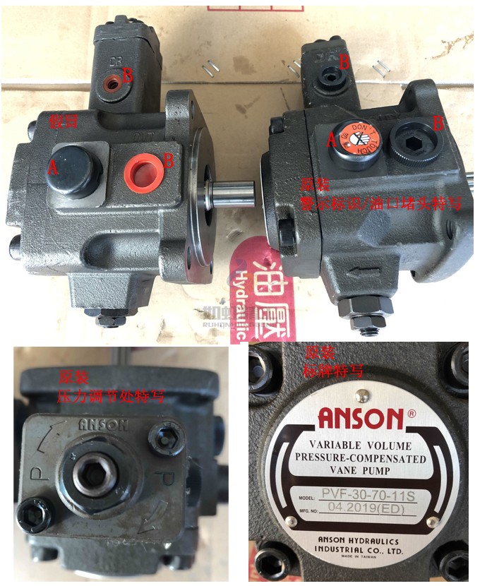 b∶原裝VP5F系列(右),警示勿動(dòng)標(biāo)示標(biāo)志清楚,如圖右A,且不易掉落。油口堵頭特意設(shè)計(jì)內(nèi)六角,邊緣有大凸起有齒紋,如圖右A,方便取出。且堵頭上有英文標(biāo)示ANSON(上圖右為堵頭LOGO特寫)。