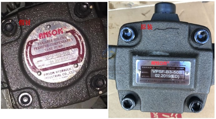 真假ANSON葉片泵區(qū)別1∶尾部標(biāo)牌/尾部鑄件差異。目前假貨全部為圓牌